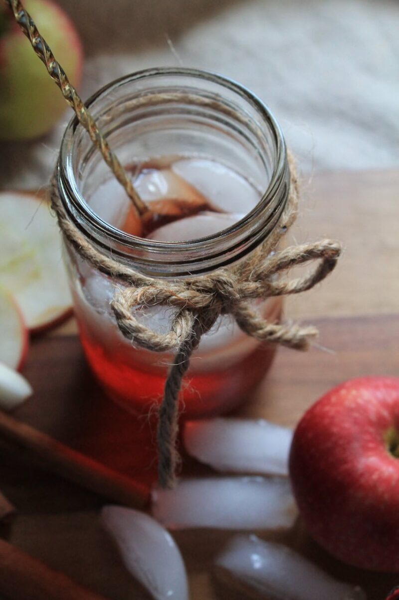 - Top with thin red apple slices and serve cold. As the bourbon, cider, and juices sit in the glass, the cinnamon sticks will infuse it with the subtle spice of cinnamon flavor.