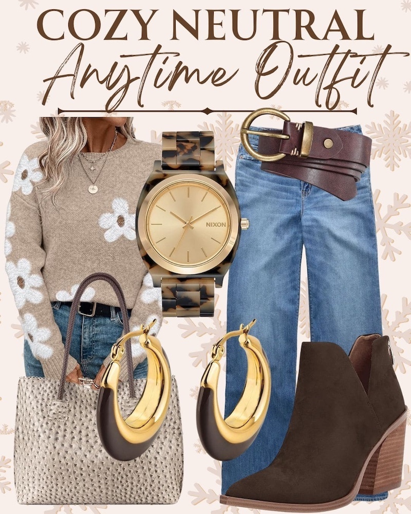 For a cute casual winter look, pair a neutral brown daisy sweater with wide leg jeans, a great brown leather belt, and simple brown ankle booties.