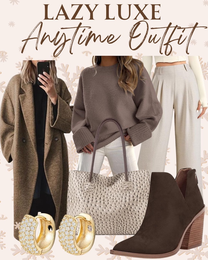 Start this look with a long brown coat that can easily be layered on with other staple neutrals like creamy wide leg slacks, a chunky oversized sweater, and an espresso brown ankle bootie.