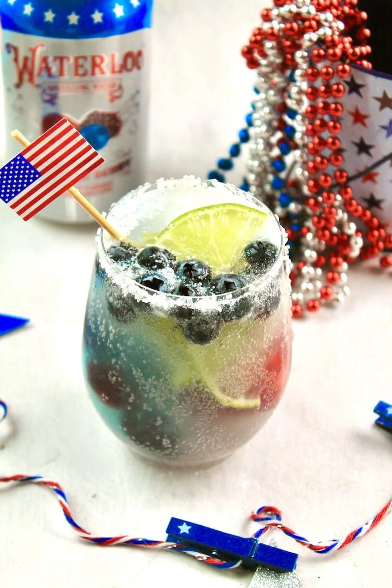 - MAKE THE DRINK:-In the bottom of your rocks glass or stemless wine glass, splash in the vodka, simple syrup, and fresh lime juice. -Stir these together with a bar spoon. -Unmold the red white and blue cubes and place in your cocktail glass to create a red layer, a white layer, and a blue layer as you build your Fourth of July cocktail.-Top the colorful cubes in this patriotic cocktail the rest of the way with the berry flavored sparkling water, such as Waterloo Summer Berry. -To finish, dot this festive summer drink with thin sliced lime wheels, and more fresh berries like blueberries, blackberries, and strawberries as desired. –Serve cold.