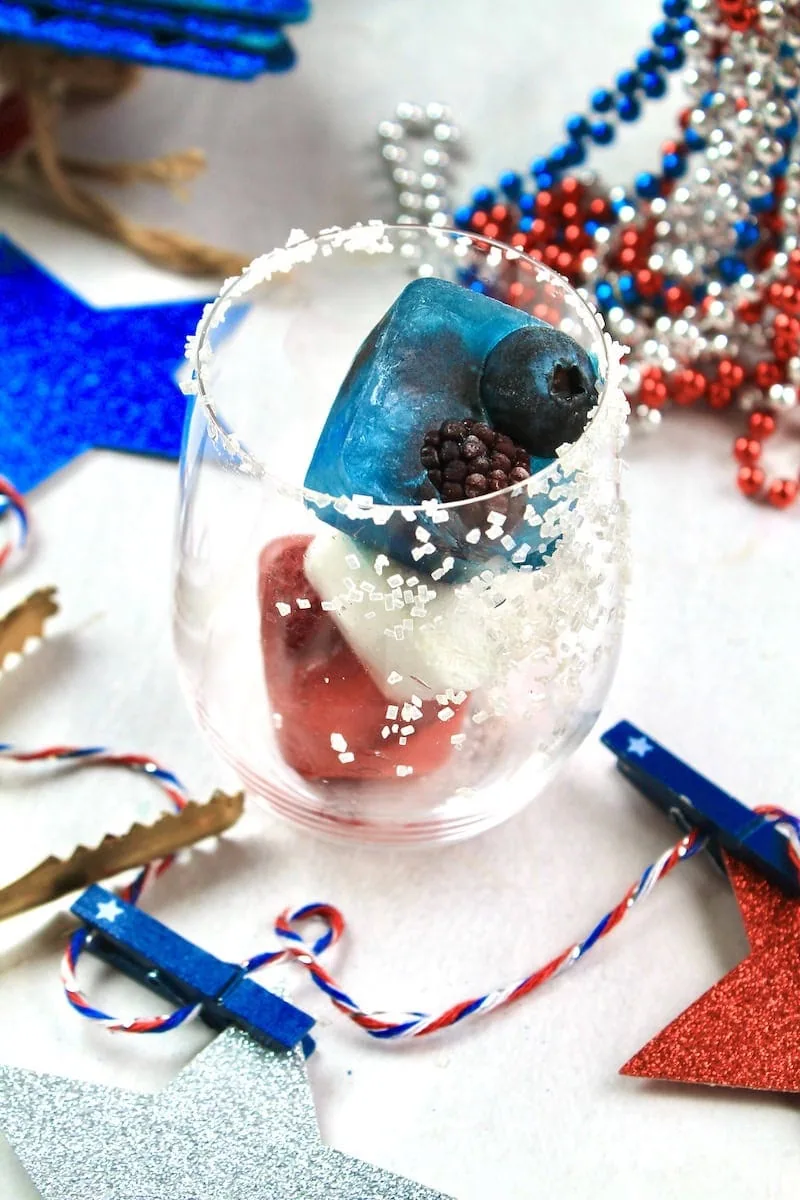 - MAKE THE ICE CUBES:– Fill the first row of your ice tray with diced strawberry pieces and top with cranberry juice for a deep garnet red color.-Fill the second row of your ice tray with coconut water.-Fill the third row of your ice tray with blackberries and blueberries. Top the fruit with more of the same cranberry juice plus 1 drop of all natural blue food coloring to die your dark berry row a true blue. -Each blue cube gets 1 drop of blue.-Set in the freezer to freeze the night before (or early in the morning that day) and let freeze until solid and set.**If making multiple drinks, make a full tray of red cubes, a full tray of blue ice cubes, and a full tray of coconut water cubes. Once frozen, unmold and set into 3 separate bowls or 3 separate freezer zip bags for easy handling/assembly. Keep cold when not in use.**