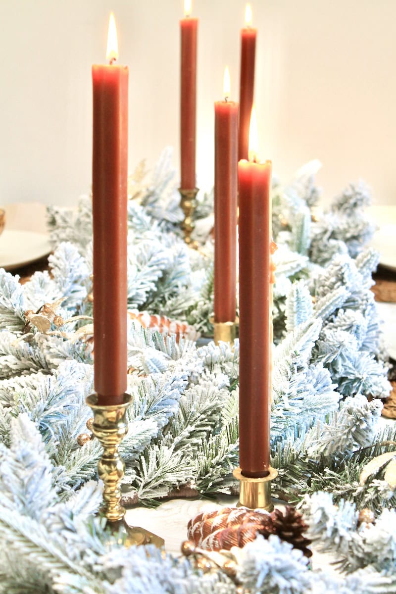 To finish, I simply added a few taper candles down the center. I added candles in a warm brown spice color to match the decor in the wreaths.