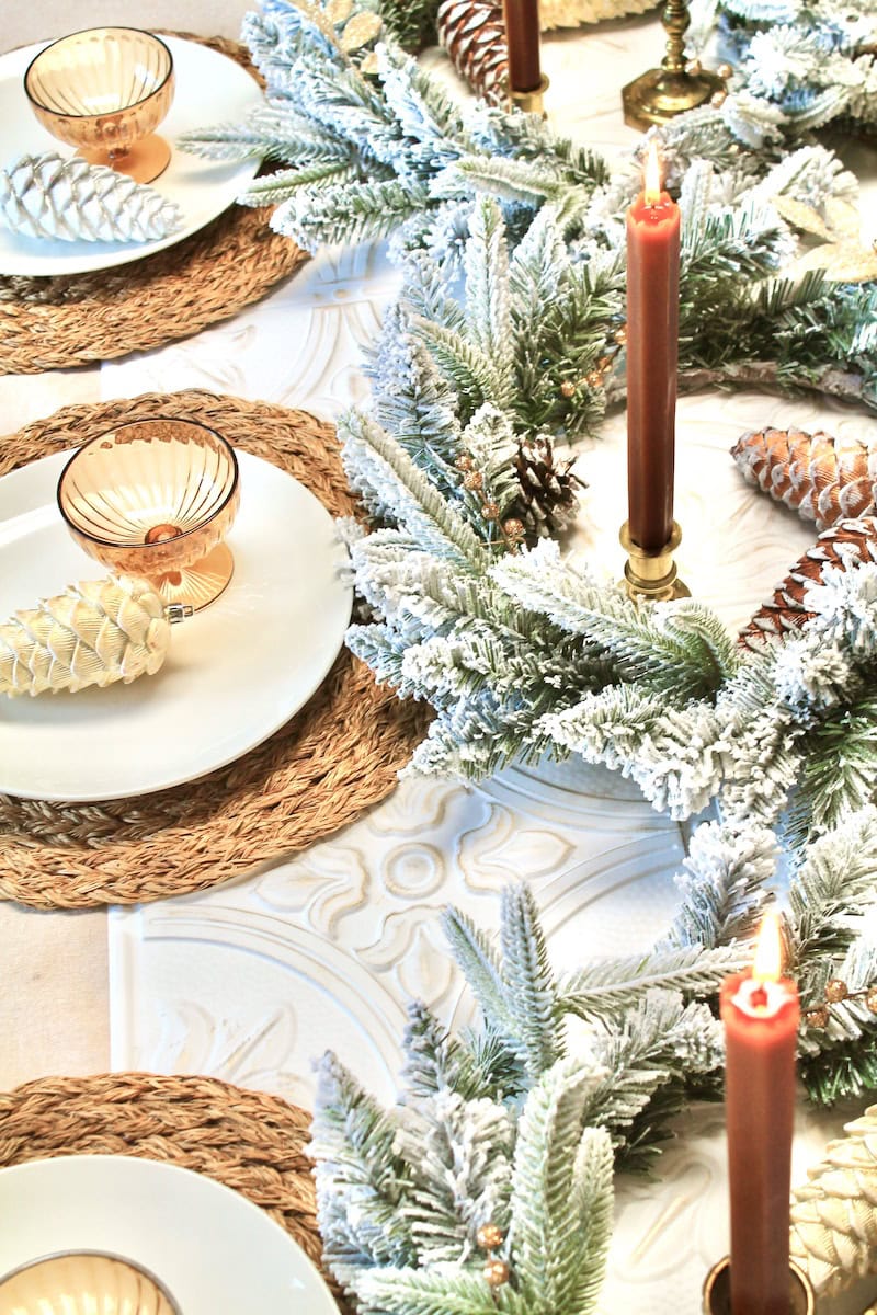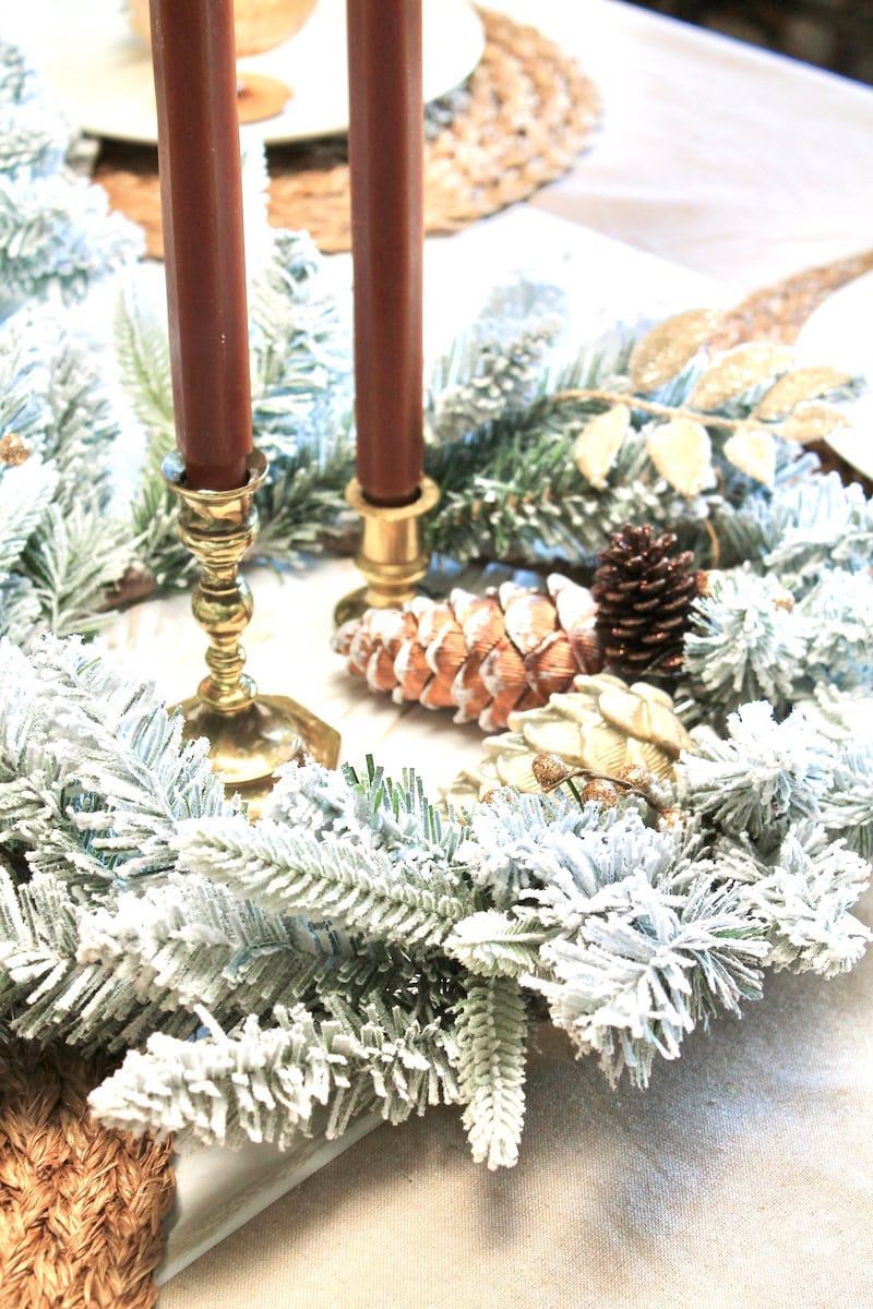 These festive and elegant homemade diy Christmas table decorations come together using three inexpensive flocked wreaths from Target. The flocked pine Christmas wreaths serve as a nice snowy display you can easily set at the dinner table for a cozy and inexpensive Christmas centerpiece that will tie everything together.