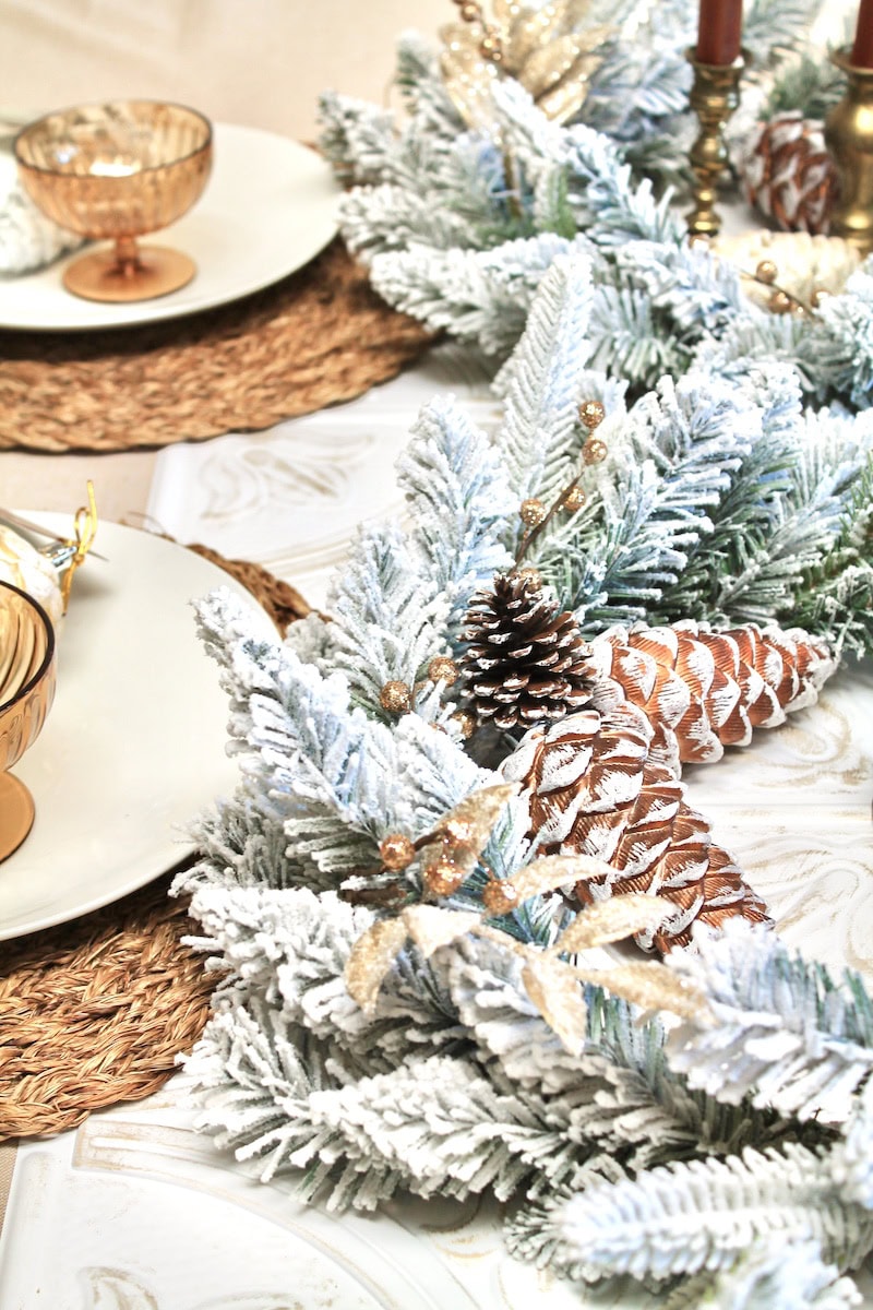 Warm copper pinecone ornaments, brown pinecone ornaments, frosty white pinecones, and soft gold pinecones are used to enhance and accent the diy Christmas table decorations.