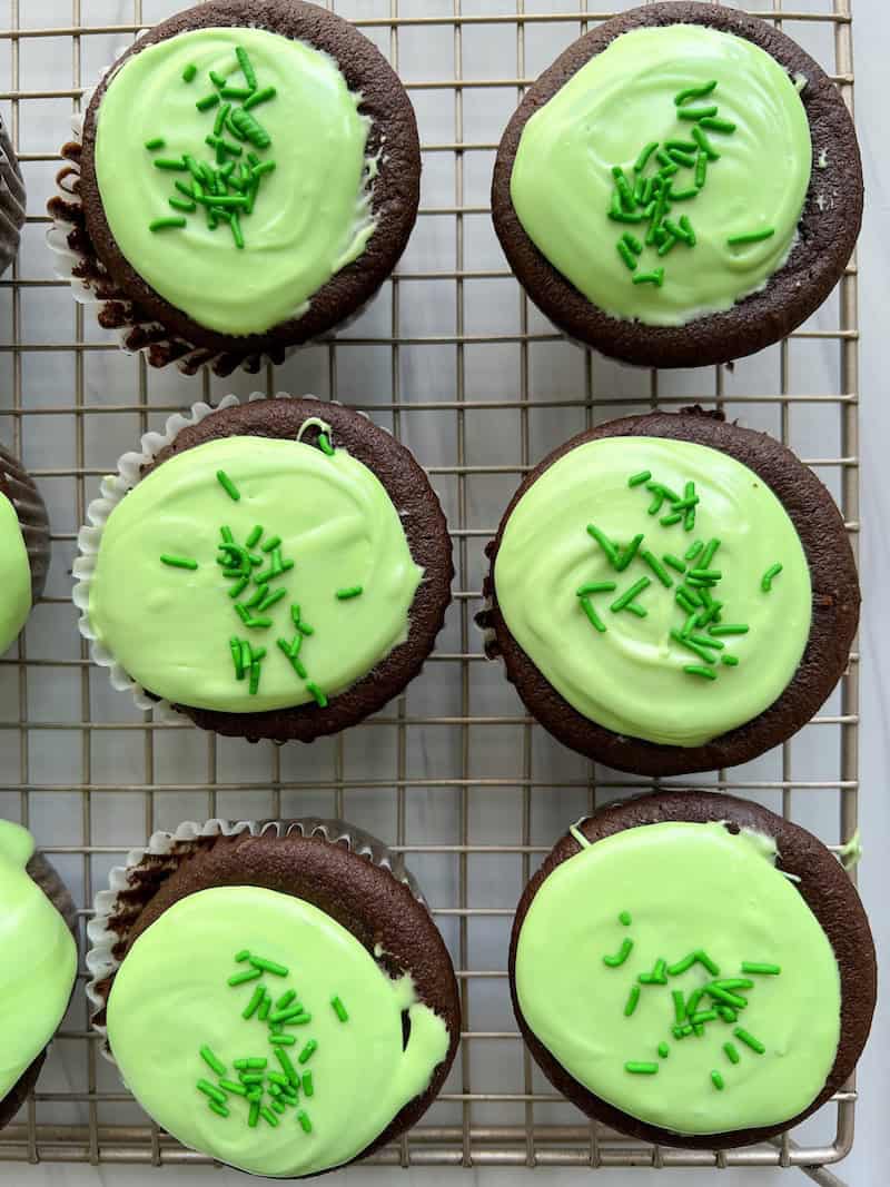 Easy chocolate cupcakes get topped with simple decorations like bright limey green frosting and simple green sprinkles to match. These make a decadent but easy and festive treat for anyone in need of quick little cupcakes with simple but colorful decor.