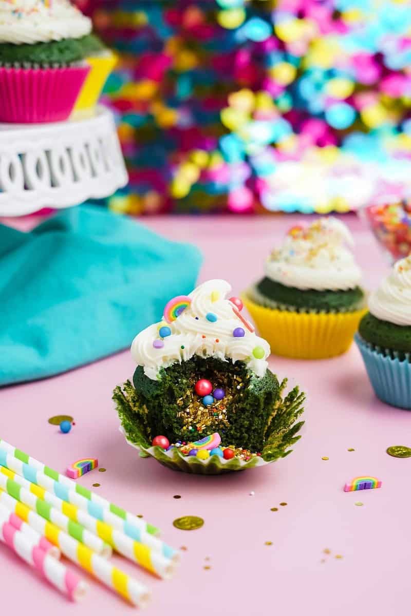 These gorgeous green velvet cupcakes are filled with gold sprinkles in the center of the cupcake and topped with colorful rainbows.  A homemade cream cheese frosting ties it all together for a festive treat that can’t be beat.