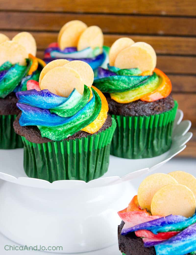 These festive deep green cupcakes are almost reminiscent of deep chocolate velvet cupcakes with a bold green tinge. Super simple decor for these bold green cupcakes is simply green sanding sugars, gold coins, and a creamy frosting. If you don’t all the ingredients to make rainbow decorations, just a chocolate gold coin candy will do!