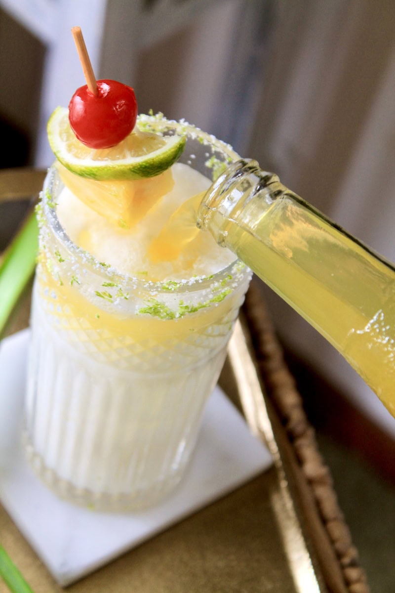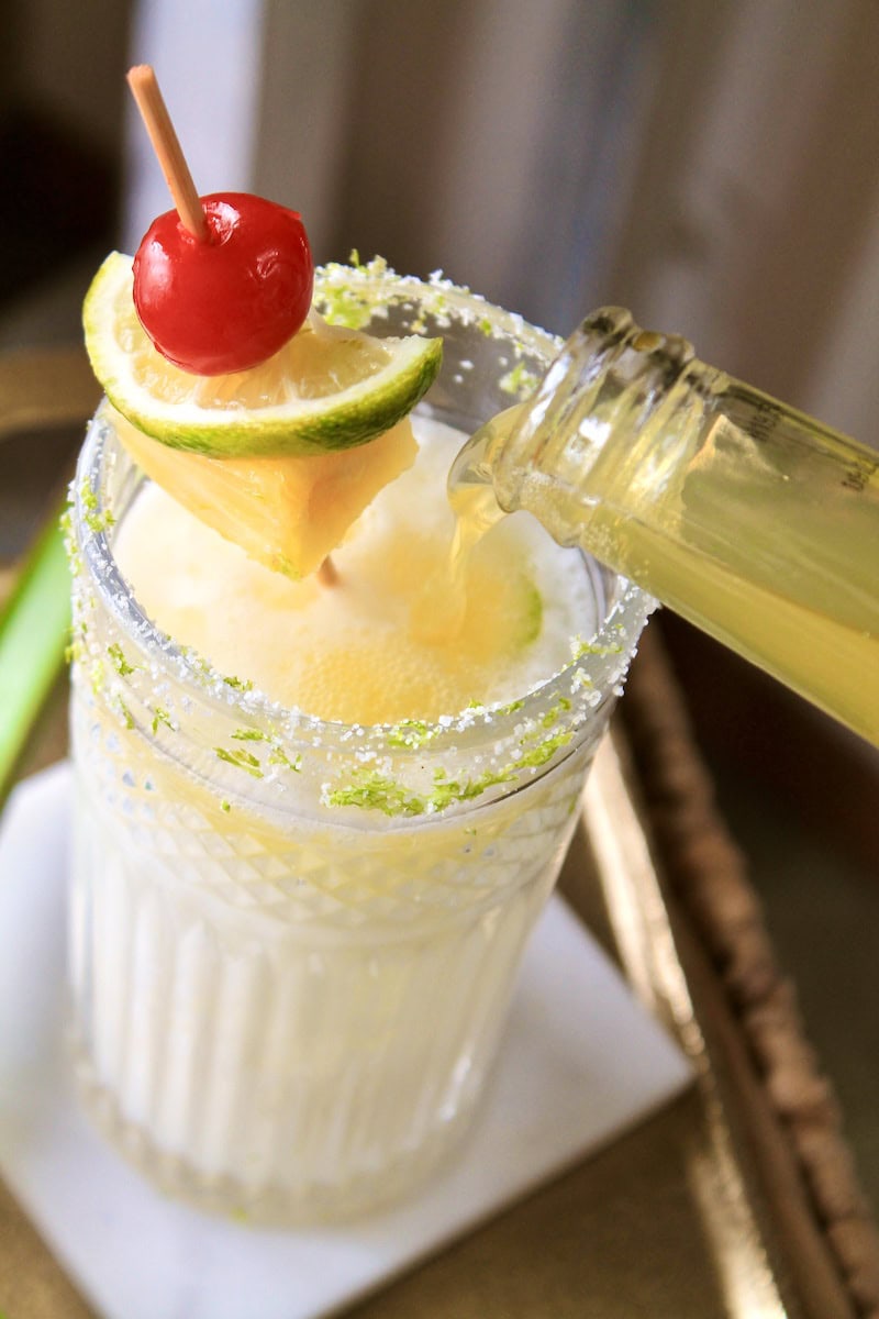 - Pour the mixture into your tall glass with the lime zest rim. Now top off with the Jarritos pineapple soda pop.