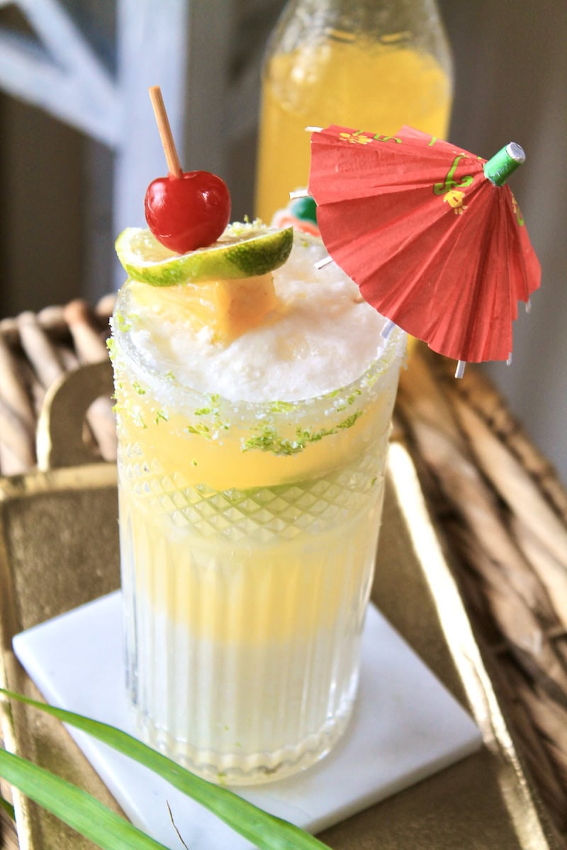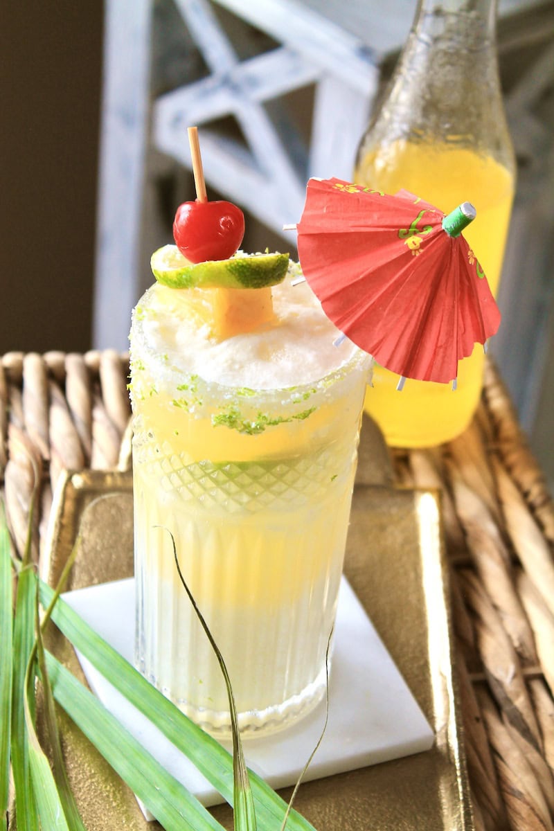 - Garnish with a lime, pineapple, and cherry skewer. Add a little cocktail umbrella, if desired, for a tropical island look. Serve ice cold.