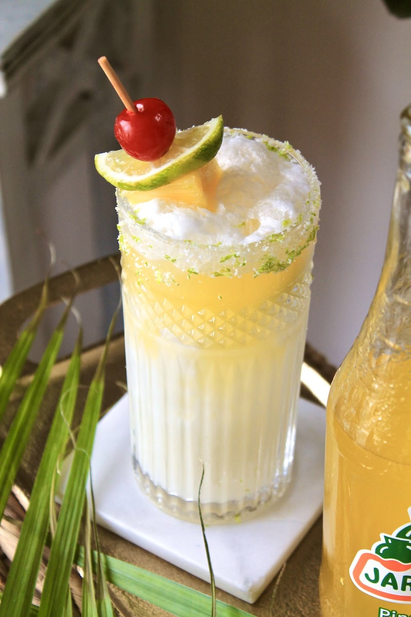 - Make the Drink:•Now, in a cocktail shaker, drop in the 2 tablespoons of cream of coconut, 2 oz of blanco tequila, 1/2 oz of fresh lime juice, and 1 oz of pure pineapple juice.•Add fresh ice enough to fill the cocktail shaker halfway. •Cover and shake vigorously until all the ingredients are combined, about 20 to 30 seconds, until creamy and frothy.•Pour the mixture into your tall glass with the lime zest rim.•Top the drink off with the Jarritos pineapple soda pop. •Garnish with a lime, pineapple, and cherry skewer. Add a little cocktail umbrella, if desired, for a tropical island look. •Serve ice cold.