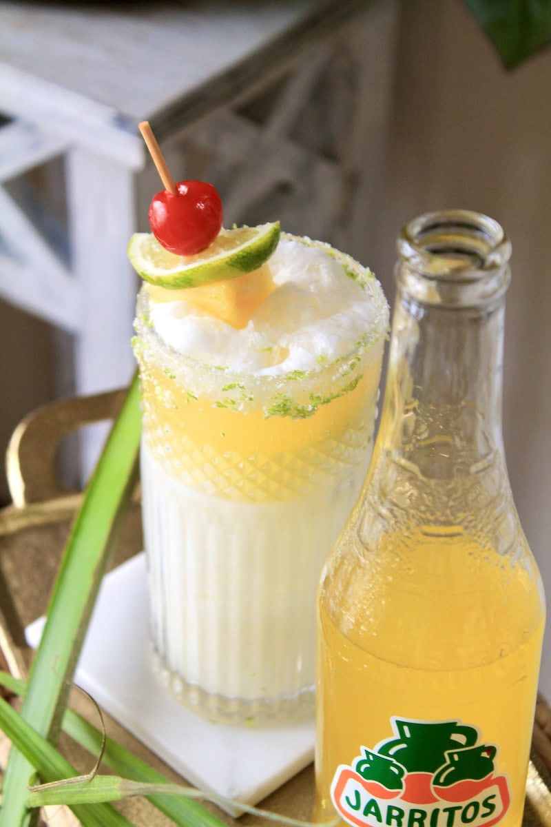 The splash of Jarritos pineapple soda adds a sunny golden finish to the top of the drink. It creates a unique effervescence in this creamy coconut cocktail. It adds a bright tropical twist to this delicious drink reminiscent of a piña colada classic cocktail.