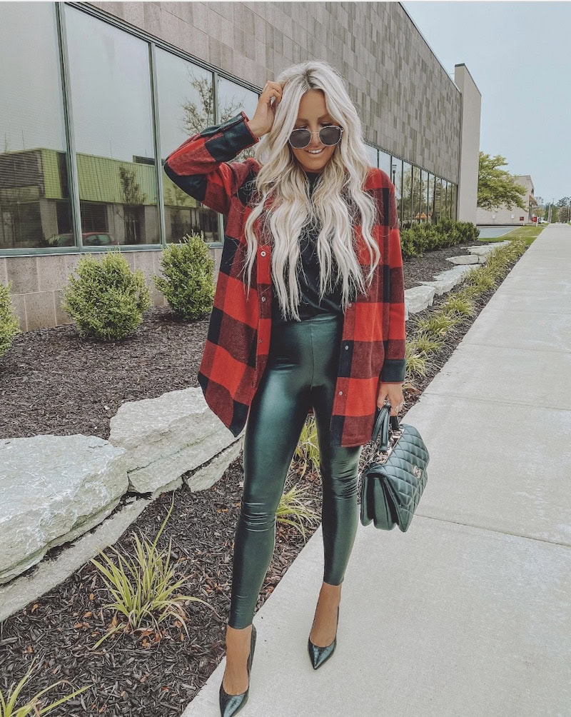 This look is an easy way to dress up that fall plaid top! Sleek leather leggings and black stiletto heels punch up the look with a favorite handbag and some shades.