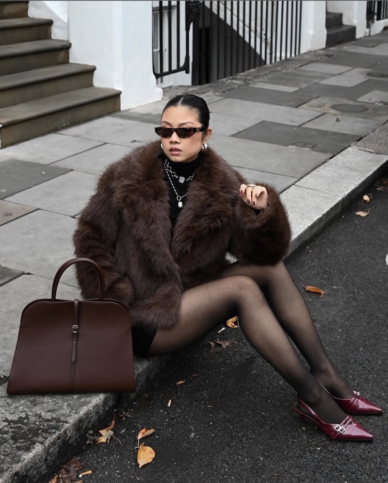 A cozy faux fur jacket in brown makes a big statement paired up with a pop of red. Slingback heels in maroon add another layer of color.