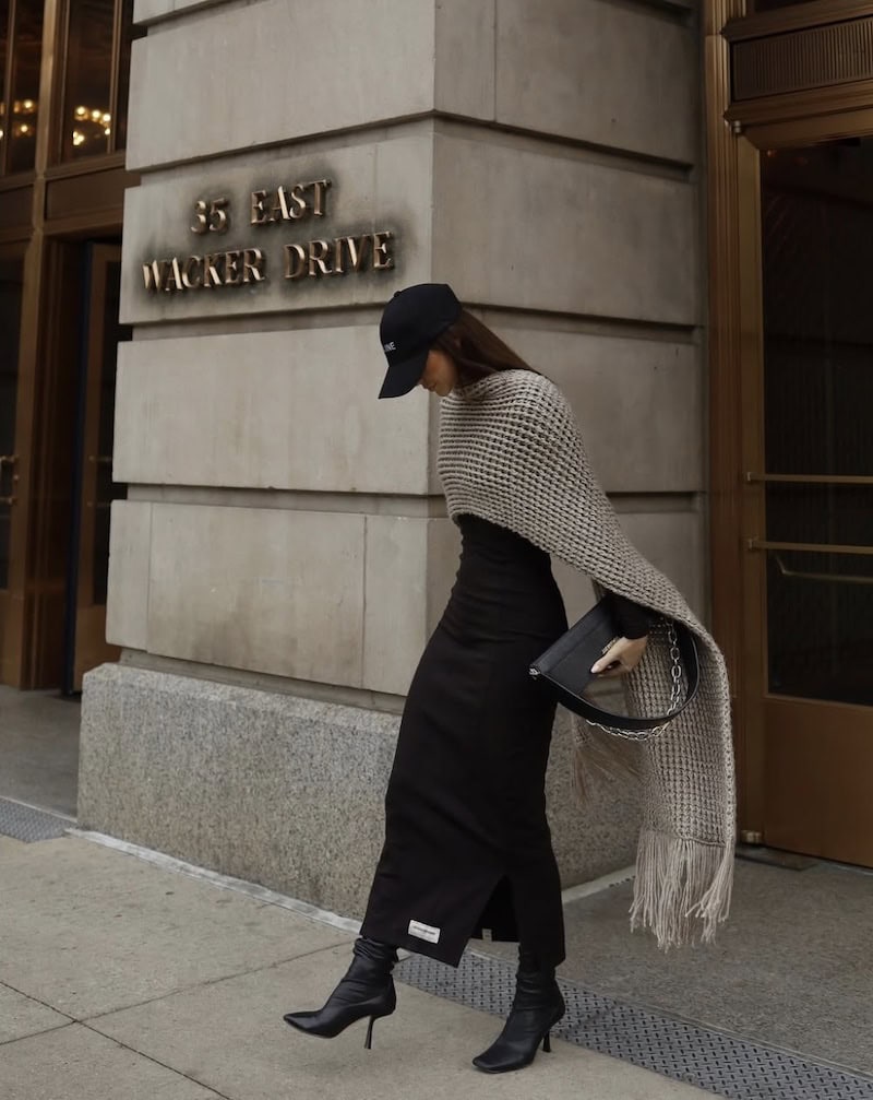Long, sleek, and formfitting, a basic black bodycon style dress creates long lines, height, and lots of versatility in any wardrobe. Here, paired with a sleek black boot, it makes a perfect fall companion for a nite out on the town without trying too hard.
