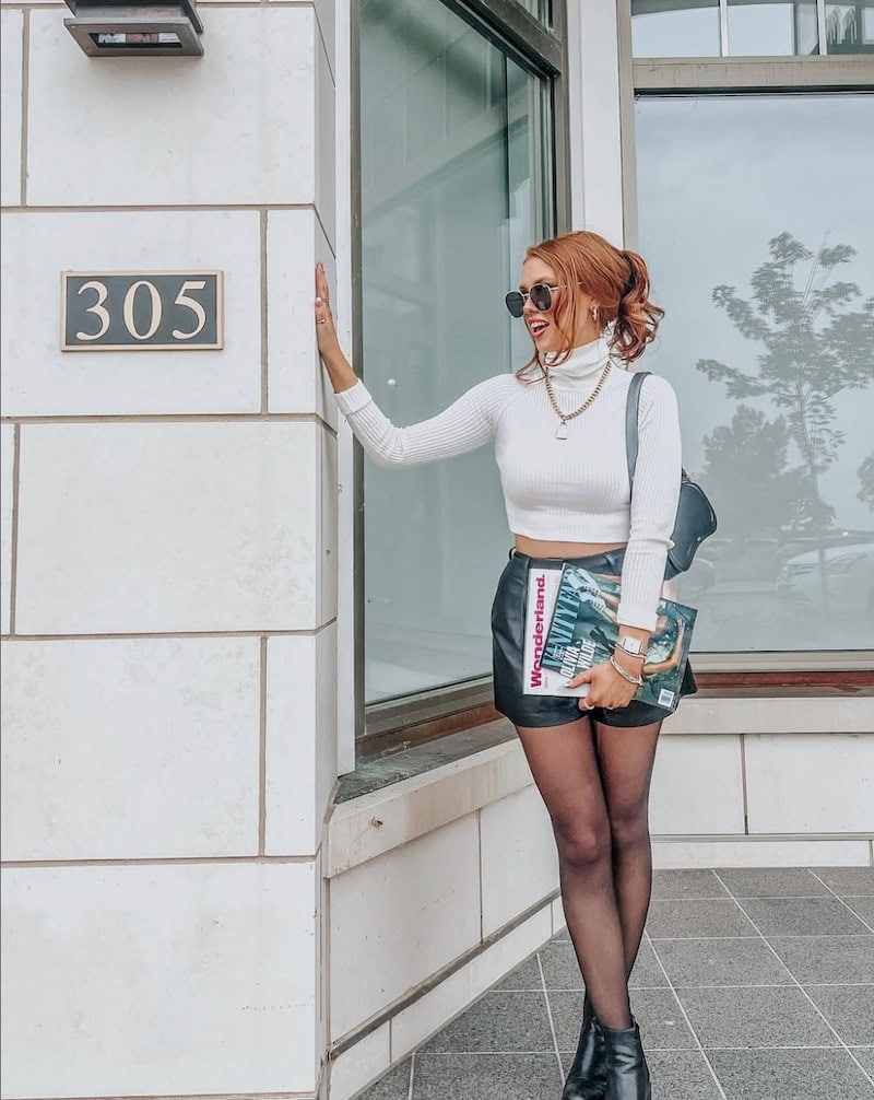 Sometimes the only way to go, is black and white. It’s a simple, timeless, and classic combination you can always rely on. Leather shorts, a ribbed crop top and a basic black ankle bootie ties it all together.