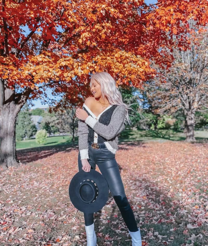 This simple fall outfit is a mix of cozy and sleek. A simple cozy cardigan and faux leather pants are paired with a wide brim hat and boots. It’s a versatile fall look you can match with other items in any basic wardrobe.