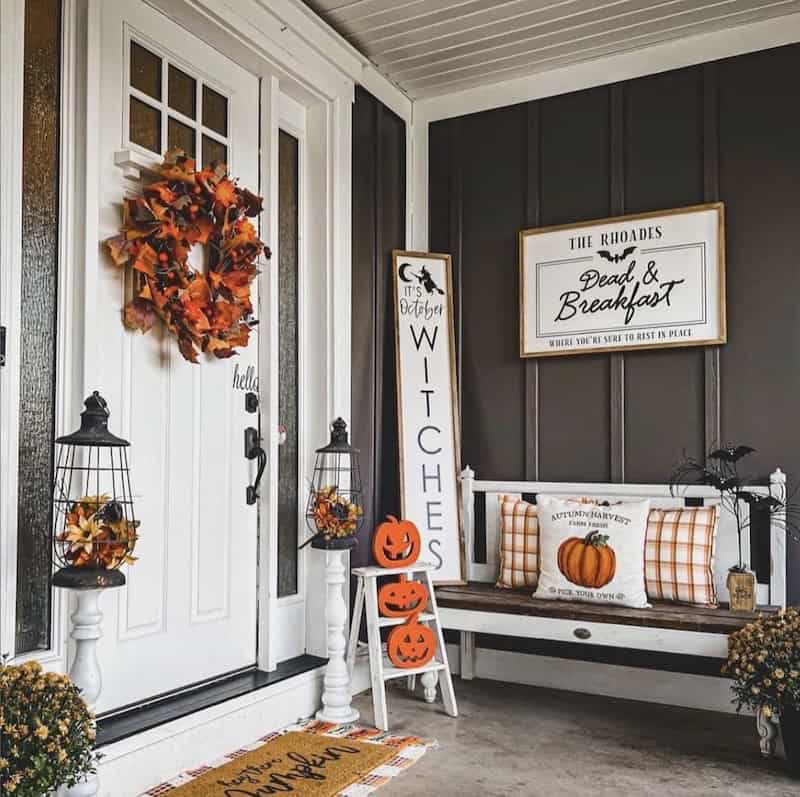 This charming Halloween porch has all the right accents: plaid cushions on the bench, smiling pumpkins on a ladder, and a festive leafy wreath. The perfect pops of orange are balanced with tones of white and charcoal grey. A few framed Halloween signs with clever notes complete the look.