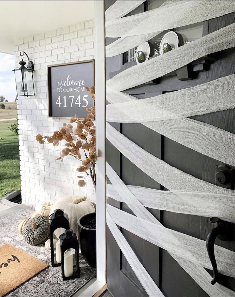 Break out the gauze and googly eyes to dress up the front door like a mummy. A little fabric goes a long way in this super simple and fun last minute diy Halloween decoration you can make on a budget.