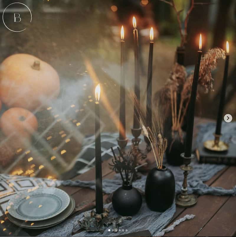 Keep the quiet eerie flow and with a dark glow from black tapers that add mystique to the table.