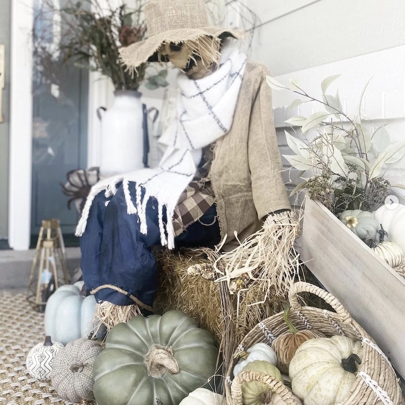 A scarecrow gets a simple makeover with a white plaid scarf, a burlap hat, and pumpkins in soft green tones. This is a fun and festive last minute outdoor Halloween decor idea if you have plain straw bales of hay that need dressing up.