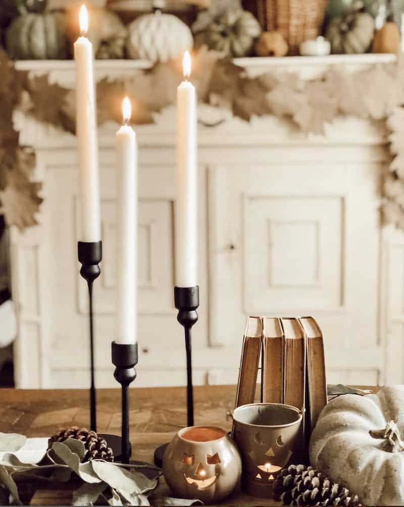 Mix high and low halloween candle holders with votives in different containers to cozy up a coffee table, library desk, or fireplace mantel.