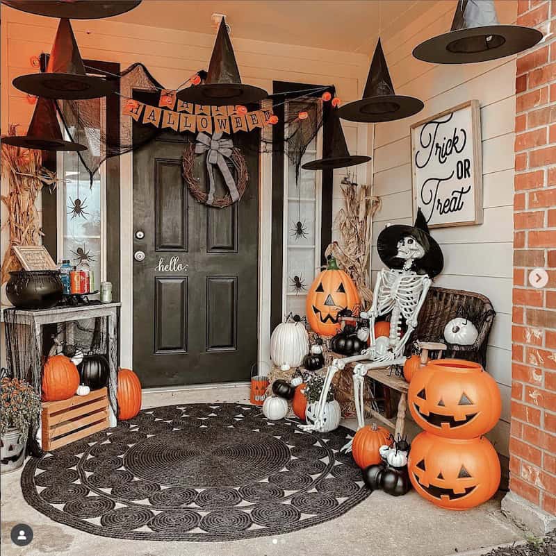 Hanging witch hats overhead make a fun statement that adds to the cauldron, pumpkins, and spiders in this festive front porch.