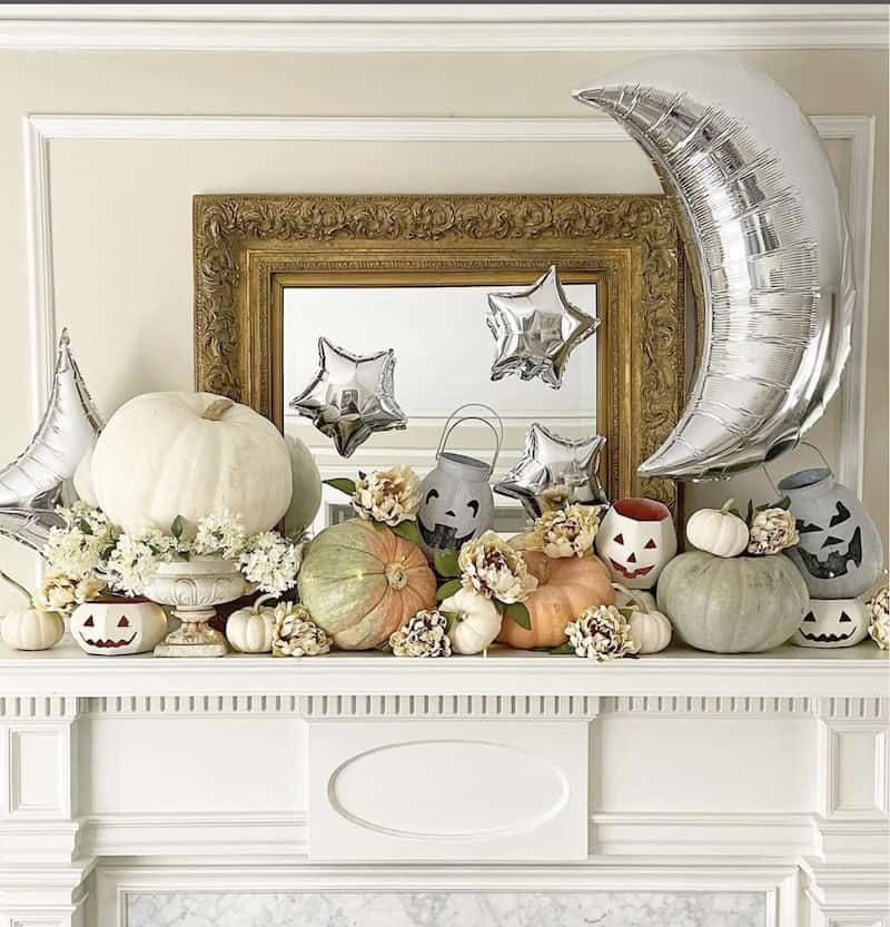 This kid-friendly non-spooky Halloween decor is made sweet and simple in neutral colors with the most darling finishing touch: foil balloons. Pumpkins and lanterns in soft colors are framed with cream flowers to soften everything around the edges.