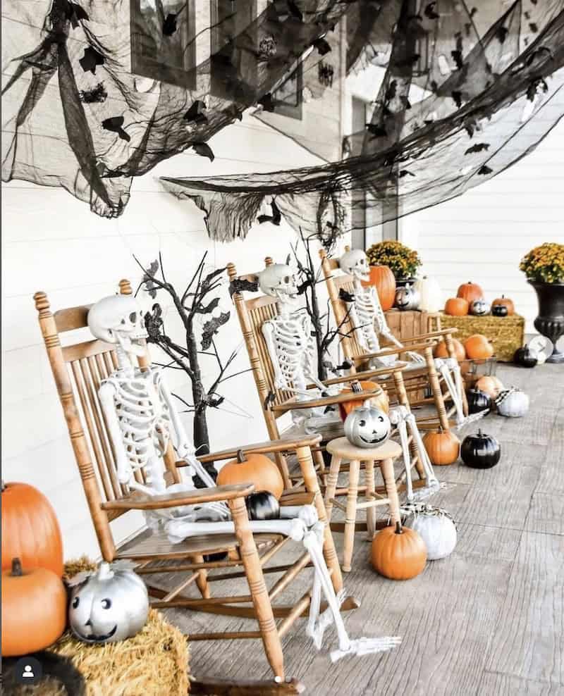 Set up some life-sized skeleton guests with pumpkins and mums for a big statement with simple items.