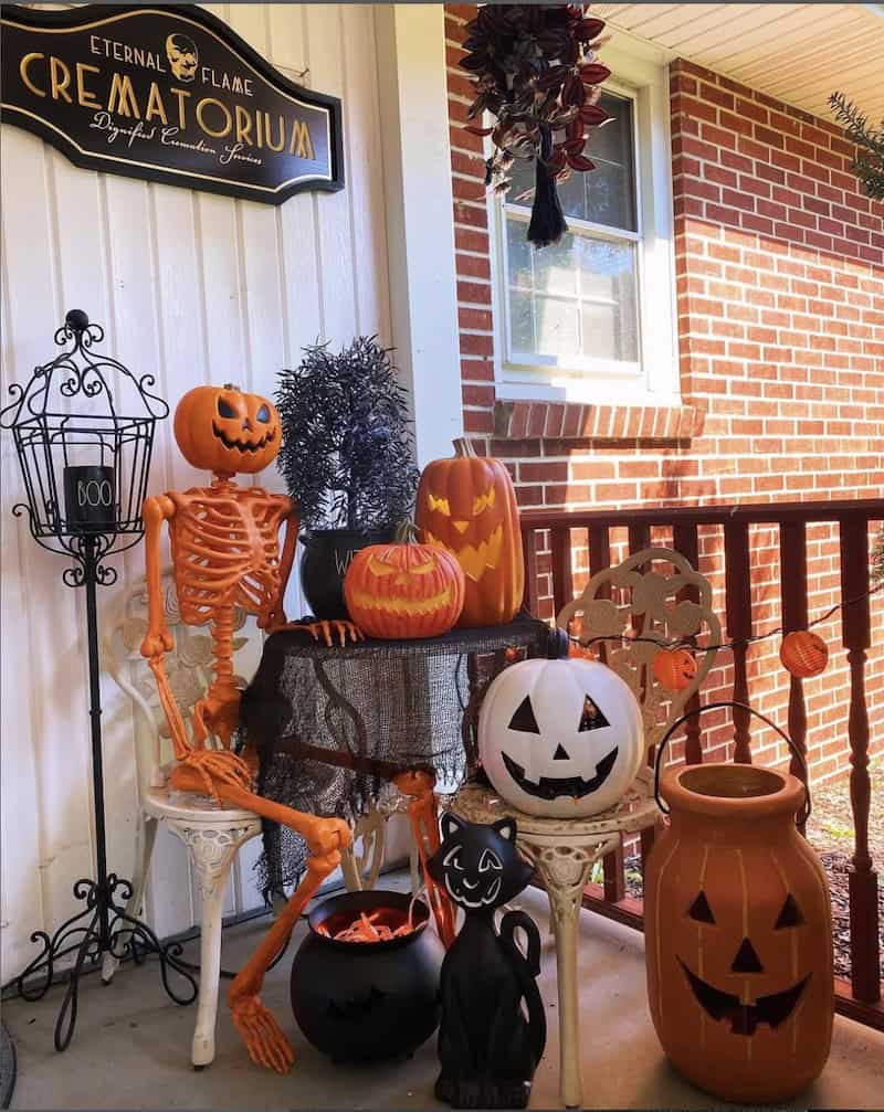 An antique metal table set gets a makeover with festive friends in black and orange. The life-sized pumpkin head skeleton steals the show!