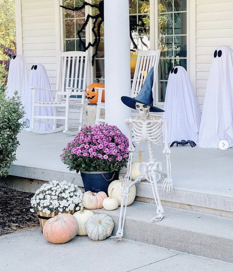 Friendly outdoor ghosts in flowing white sheets set a fun backdrop for this full-sized skeleton with a witch’s hat. Purple chrysanthemums and pumpkins finish the look to accent the front steps.