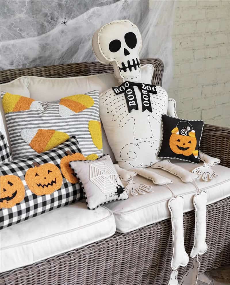 A mix of cozy cushions creates an inviting Halloween mood on this front porch seating area that bursts with comfy accents like a life-sized cozy skeleton cushion.