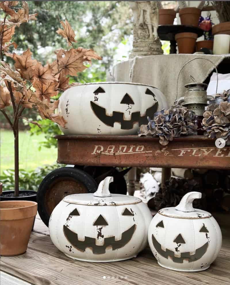 Jolly smiling tin pumpkins help to style a happy and sweet scene. Set atop a little vintage wagon, they instantly add so much charm to a festive fall patio area.