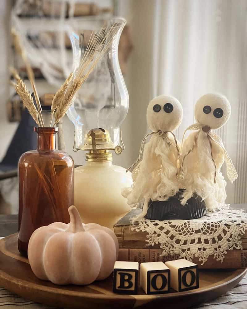 These sweet little ghosts are styled up with vintage accents like a terra cotta pumpkin, an old lace doily, ‘boo’ wood blocks, and a vintage oil lamp in back. A simple brown glass vase with stalks of wheat complete this little table accent idea that can spice up any corner of the house.