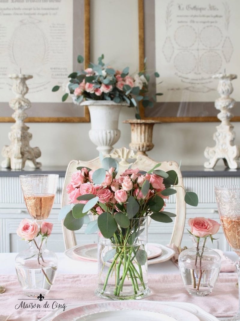 3. Blushing Pink Roses and Eucalyptus Valentine’s Day Table Decor
