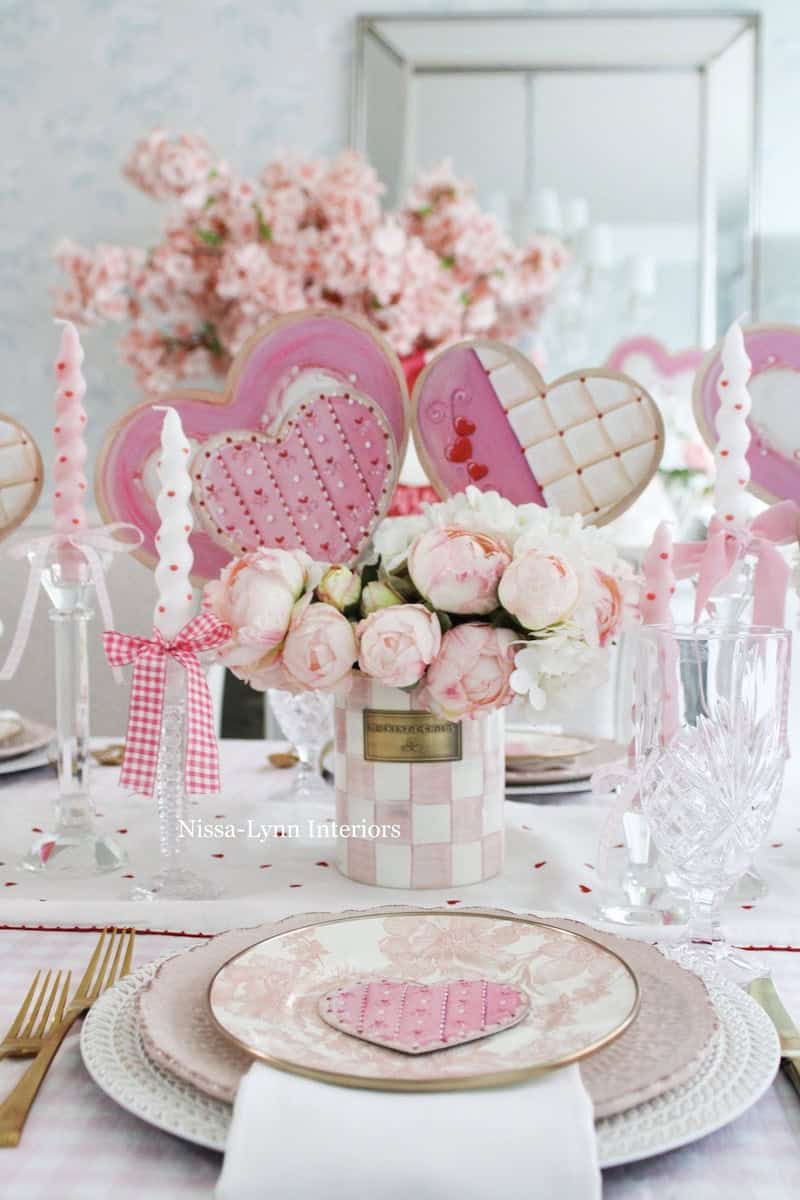 The pink check pattern on the MacKenzie-Childs vase accents the lacy pale pink flowery plates. At the same time, festive swirly heart taper candles play off of the heart decorations held in the vase.