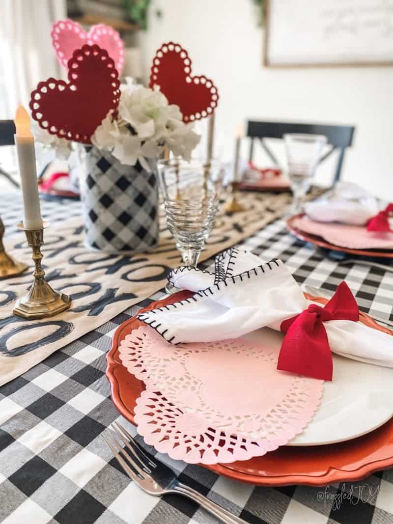 This is a clever way to incorporate darker colors into your Valentine’s Day tablescape. A black and white checkered tablecloth sets the tone for all the other elements at the table. A matching checkered vase hold heart-shaped decorations mixed with simple white flowers.